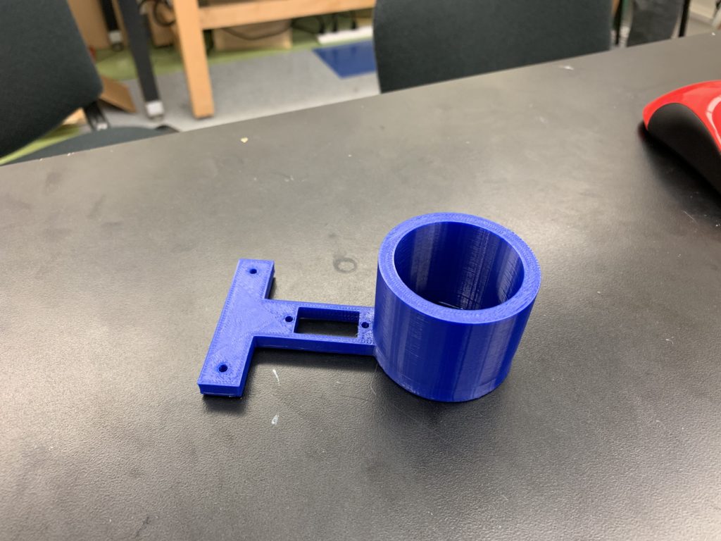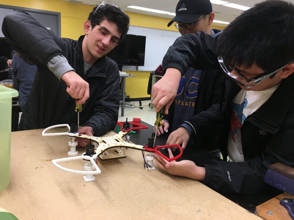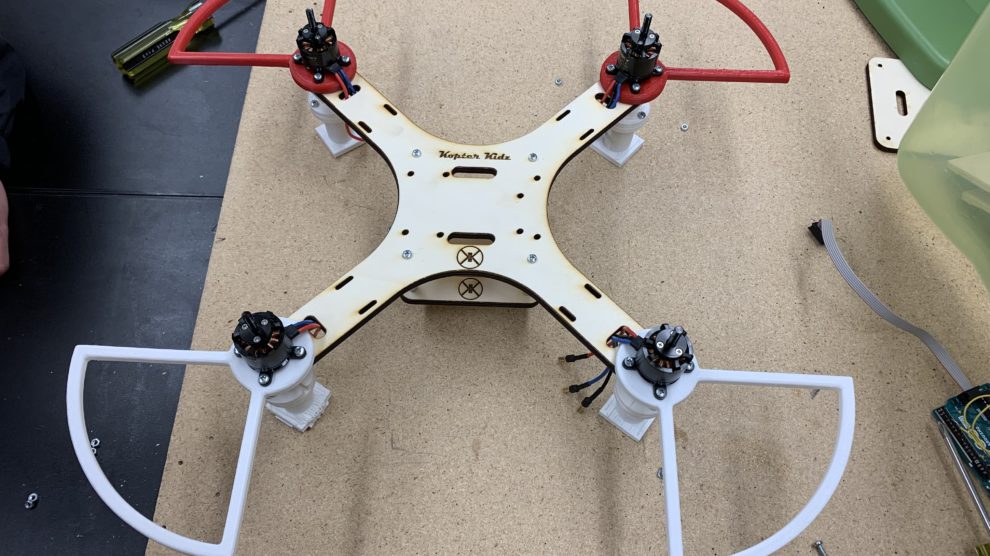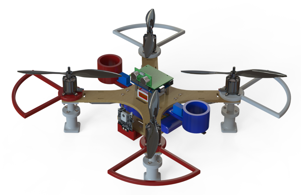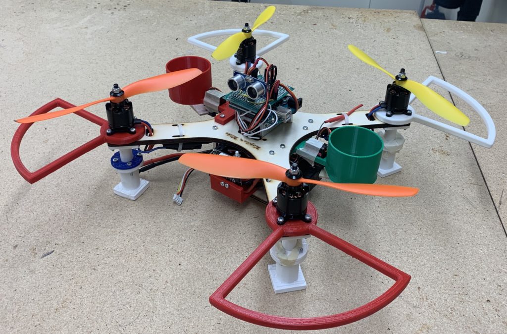 We used an Arduino, “PixyCamera”, and ultrasonic sensor to accomplish this task. The whole drone was either laser cut or 3D-printed, so the only tool required for assembly was a screwdriver. The landing gear featured an “active” design, meaning it was able to absorb impact with springs that were placed inside each landing gear.