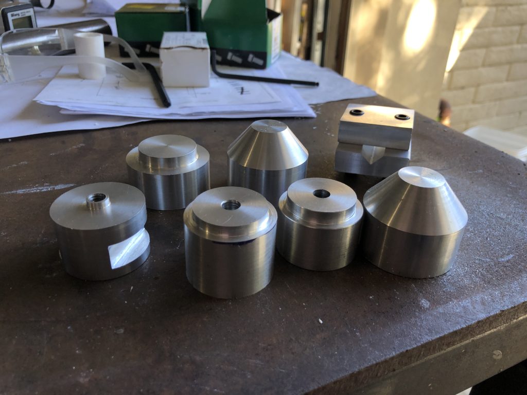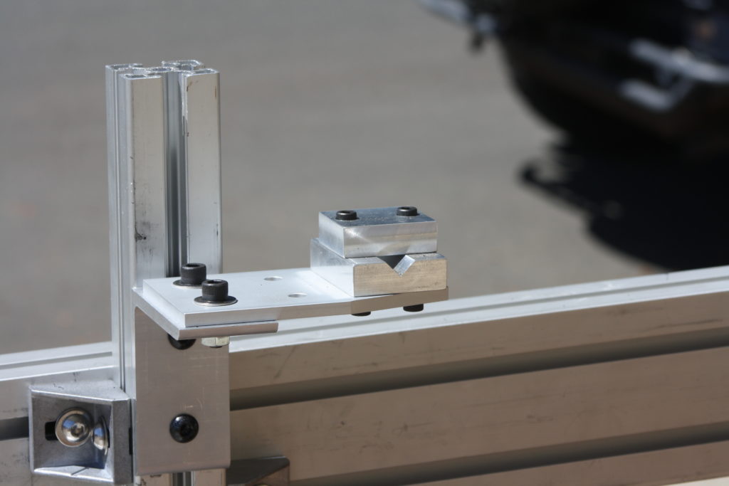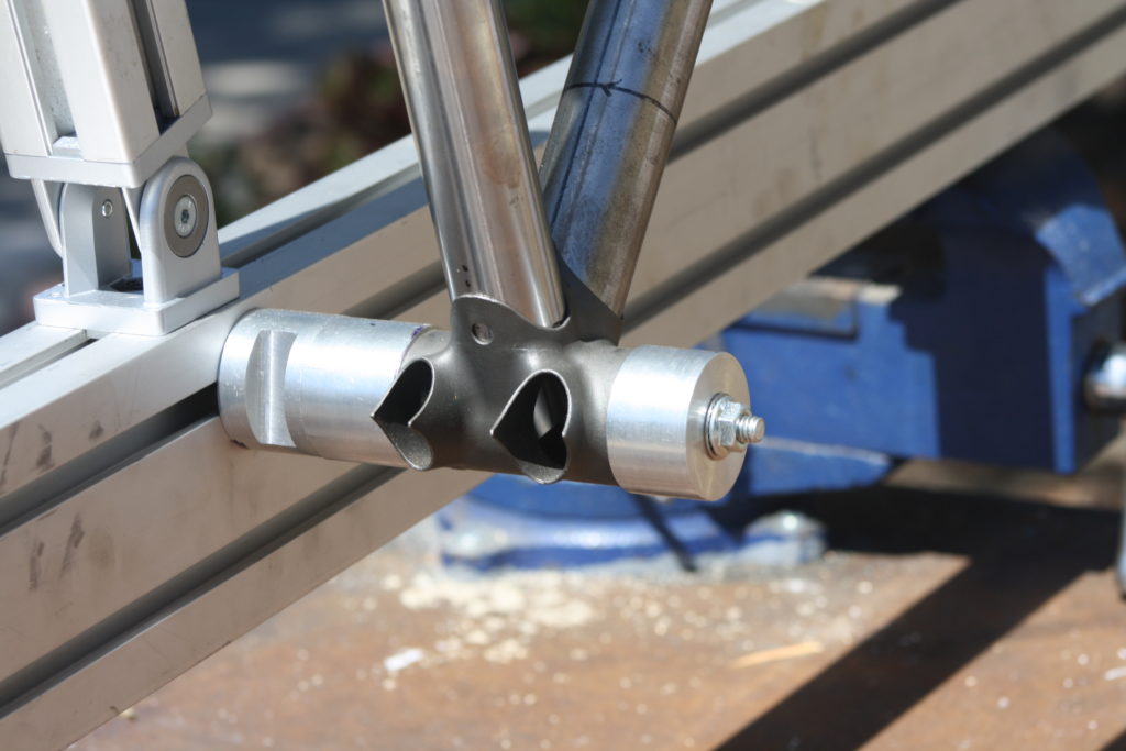 In order to ensure proper alignment of the rear wheel of the bike, a dummy axle was created with a centering feature. The center indent on the dummy axle ensures it always sits in the centerline of the bike when placed in the jig. The outer surfaces of the dummy axle are spaced to match the hub of the bike.